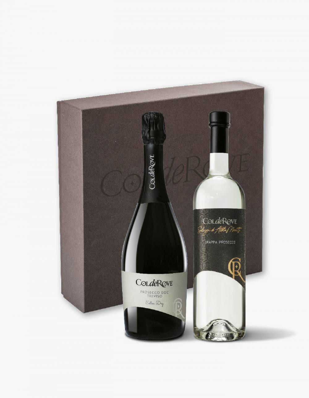 Un dono che unisce due anime dello stesso vitigno: la Grappa di Prosecco, distillata con arte e finezza, e il Prosecco DOC Treviso, fresco e vivace.