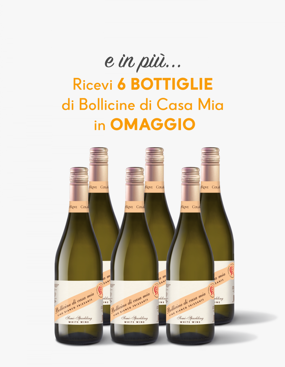 - 6 bottiglie di Bollicine di Casa Mia - le bollicine frizzanti sempre più moderne e pratiche grazie alla chiusura con il tappo STELVIN che garantisce le qualità organolettiche del vino. Alcol:10,5 % vol. Btg:0,75l.