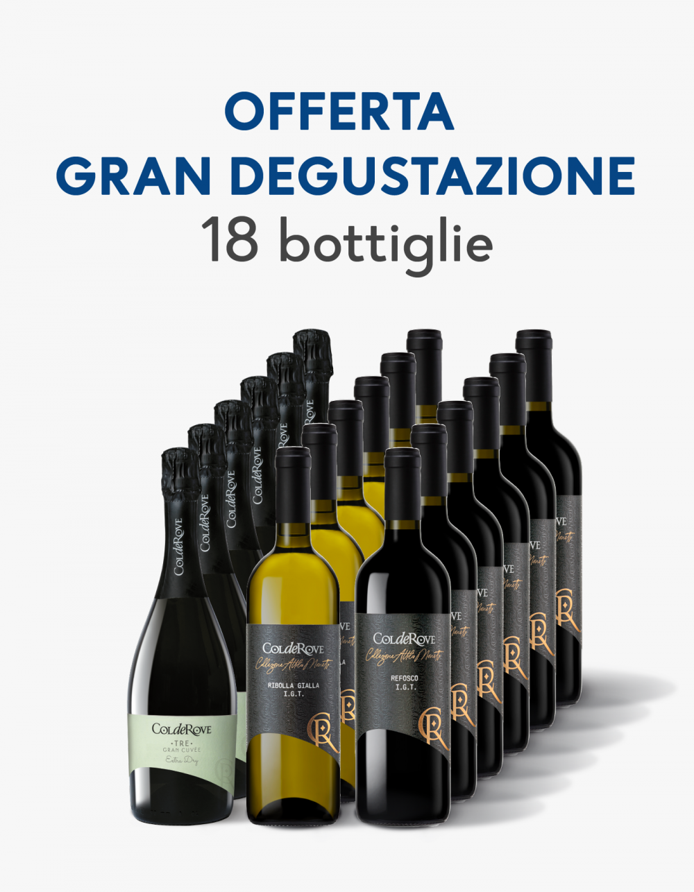 Degustazione da 18 bottiglie che racchiude eleganza e brio delle bollicine spumanti e l’anima del Friuli Venezia Giulia con un rosso di carattere e struttura come il Refosco e la spiccata sapidità della Ribolla.